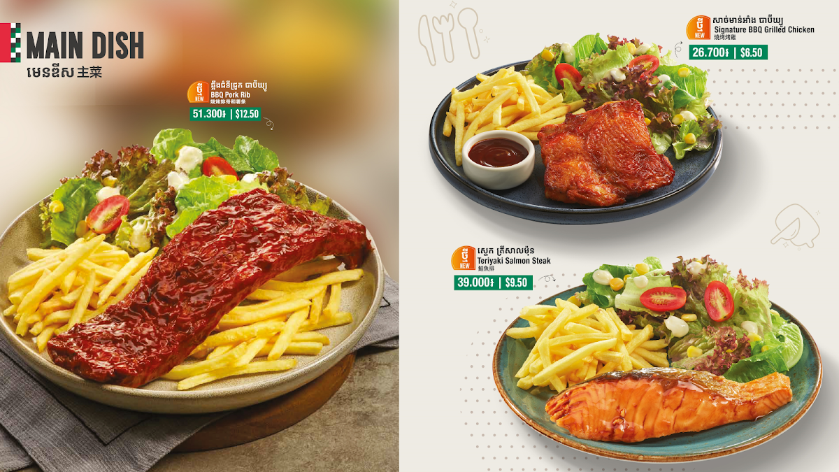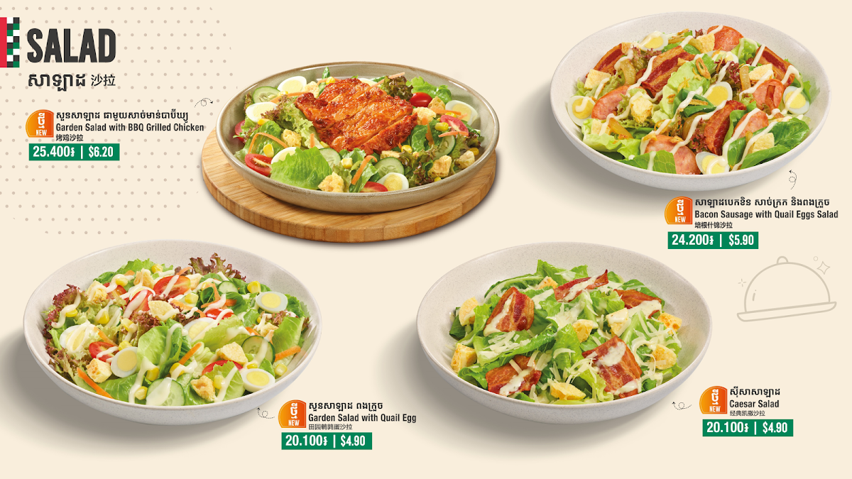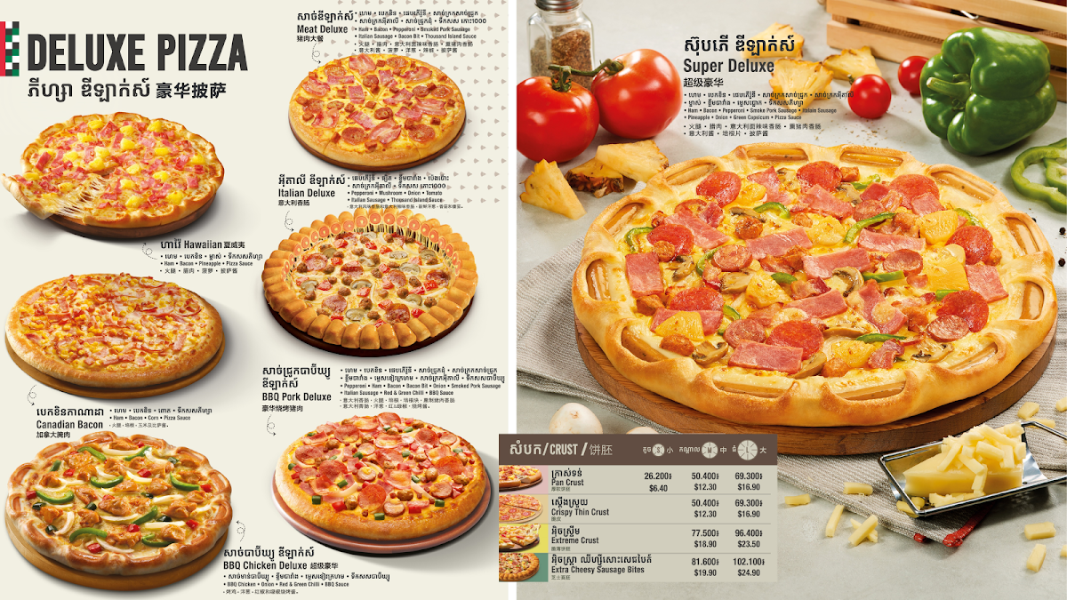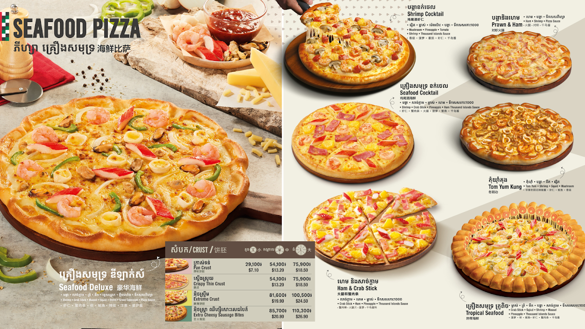 The menu at The Pizza Company in Ta Khmao City offers an impressive variety of dishes that cater to diverse tastes, from delicious pizzas to hearty pastas and refreshing salads. Their pizza selection is expansive, featuring options like the Puff - Hawaiian, Puff - Deluxe, Puff - Seafood Puff, and Puff - Ham & Crab. For those craving a special twist, their Croissant Crust pizzas such as the Croissant Tropical Seafood Pizza and Croissant Korean Pork Bulgogi Pizza are unique and flavorful options. There’s also a selection of Hot Mala Pizzas, including the Mala Korean Style Chicken Wing Pizza, available in various sizes like Medium and Large.